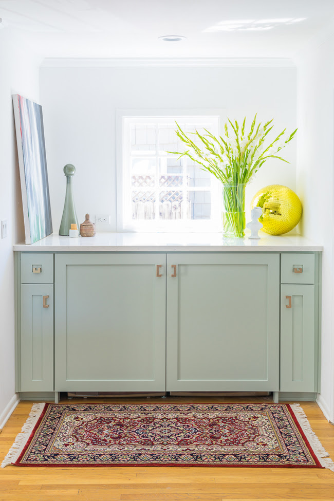"It's almost like a desaturated light mint color," says Murray of the unique shade. "We needed color on the cabinets, and I didn't want it to be too bold, because it needs to work with the other design elements, like the flooring."
